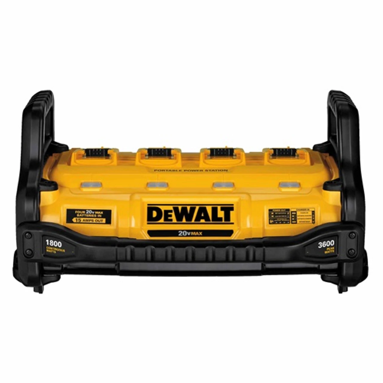 The 1800 Watt Portable Power Station and Parallel Battery Charger allows for AC power in remote locations for convenient portable power. Able to run most corded tools, it provides 1800 Watts (15 amps) continuous power and 3600 Watts peak power. The DCB1800B runs on four DEWALT 20V MAX batteries (including FLEXVOLT), and for high power applications, four 20V MAX 3.0Ah DEWALT Batteries (DCB200) or higher amp hour are recommended to provide the best results. Not only can the 1800 Watt Portable Power Station power a corded tool remotely, but it also becomes a multi-port parallel charger for up to four DEWALT 20V MAX Batteries (including FLEXVOLT) when plugged into a wall outlet via extension cord (batteries and extension cord sold separately). Compact and lightweight, the 1800 Watt Portable Power Station weighs just 18lbs (without batteries) and is easily portable. Without the need for gas to run, there are no fumes or carbon monoxide emitted from the device. In addition, the 1800 Watt Portable Power Station can be used to provide temporary power in areas where noise is restricted such as a jobsite with strict regulations. With an integrated temperature-controlled cooling fan and heavy-duty roll cage, the Portable Power Station is a durable and convenient power solution for a variety of uses. FEATURES 1800 Watt Portable Power Station 4 Port Parallel Charger Four 20V MAX batteries in (including FLEXVOLT), 15 amps out Batteries and extension cord sold seperately Runs most variable speed power tools SPECIFICATIONS 120V Receptacles 1 Charging connection: Male 120V plug Batteries compatible: 20V MAX Charging time: 2 Hours, 4.0 Ah battery Height: 10.75 IN Length: 12.75 IN Width: 21.30 IN Shipping weight: 22 lbs Weight without batteries: 18 lbs Required number of batteries: 4 Rated current (120V/240V): 15 amps Max curent (120V/240V): 30 amps Rated AC output: 1800 Watts MAX AC output: 3600 Watts Temperature range: 32-104 degrees F (0-40 degrees C) Batteries compatible: 20V MAX Charging rate: 2.0 amps Compatible with: 20V MAX batteries Indicator lights: Inverter and charger, operation and fault, low battery Quantity of batteries charged: 4 Sequential or simultaneous charging: Simultaneous Sinewave type: Modified
