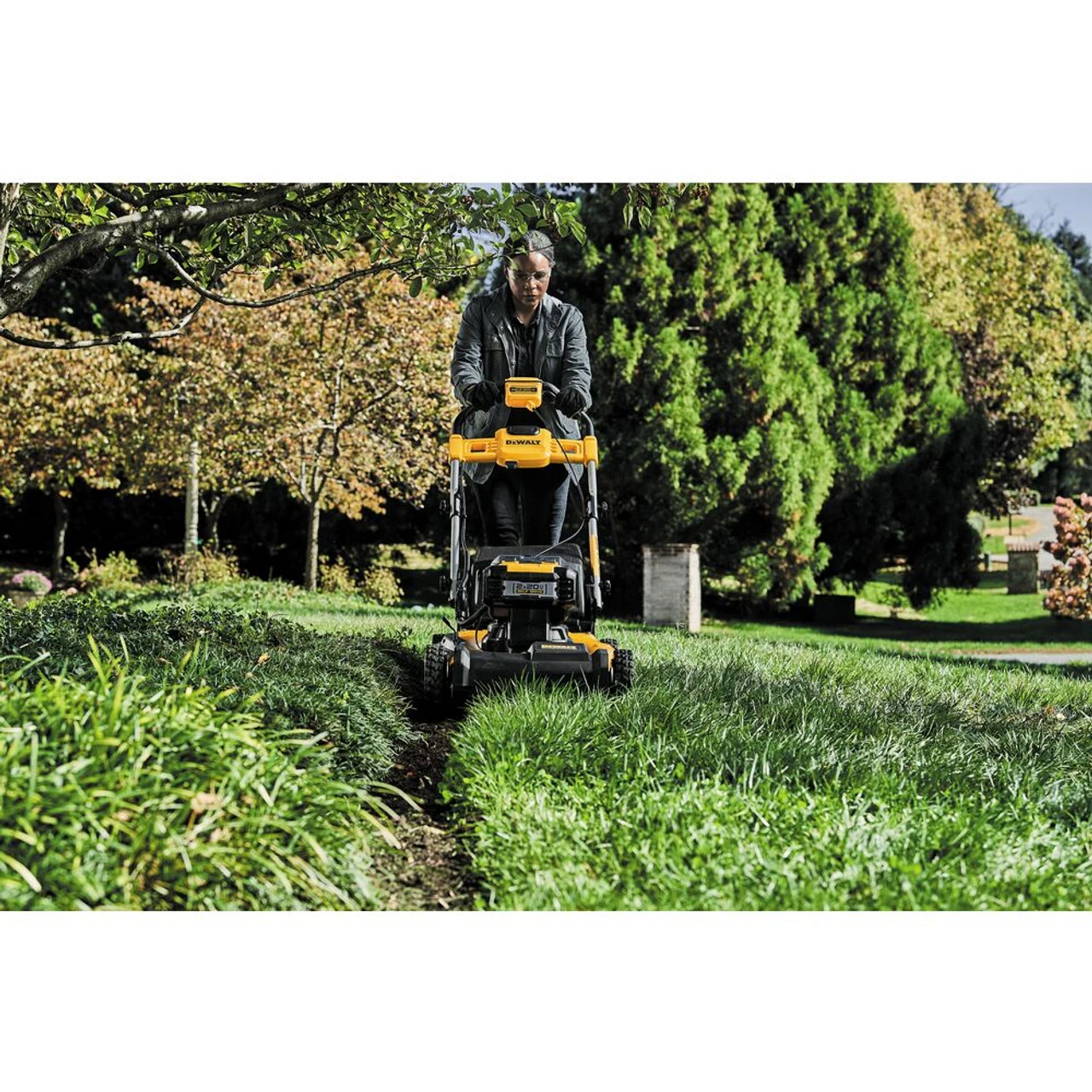 Featuring a brushless, direct drive motor that delivers up to 60 minutes of runtime in one charge**, this self-propelled lawn mower has the power you need to get the job done. Innovative, auto-sensing technology achieves higher rpm so you can cut thicker grass whether you are mulching, bagging, or using the side discharge. With a fold-over handle for convenient transport and integrated vertical storage, this cordless mower takes up 70% less space in your garage than it does when in operation. Count on the DEWALT FWD Self-Propelled Lawn Mower to deliver the power needed to tackle your lawn in comfort. Features: UP TO 60 MINUTES OF RUNTIME per charge** using (2) DEWALT 20V MAX DCB210 10.0AH batteries COMPACT FOR CONVENIENT STORAGE: Takes up 70% less space in vertical storage vs. in operation HIGH-EFFICIENCY PERFORMANCE: Brushless direct drive motor delivers high-voltage cutting RANGE OF CUTTING OPTIONS: Cuts grass from 1-1/2 in. – 4 in. tall with dual-lever height adjustment TROUBLE-FREE TRANSPORT with fold-over handle and convenient lift handles OPERATE WITH EASE: Adjustable Self-propelled to decrease your workload GET MORE DONE: 3-IN-1 mulching, bagging and side discharge options for natural lawn fertilization or a clip-free aesthetic CUT THICKER GRASS: Innovative auto-sensing technology allows for higher rpm **Up to 60 minutes of runtime per charge, based on mowing 1/3 of grass height, on height setting 6, using (2) DEWALT 20V MAX DCB210 10.0AH batteries Specifications: HEIGHT (IN): 17.5 IN LENGTH: 34 IN POWER TOOL TYPE: CORDLESS WEIGHT: 70 LBS Includes: (1) DCMWSP244 2X 20V MAX Self-Propelled Mower (1) Collection Bag (2) DCB210 10.0AH 20V MAX Battery (2) DCB107 20V MAX 1.25 Amp Charger (1) Safety Key (1) Instruction Manual (1) Side Discharge Chute