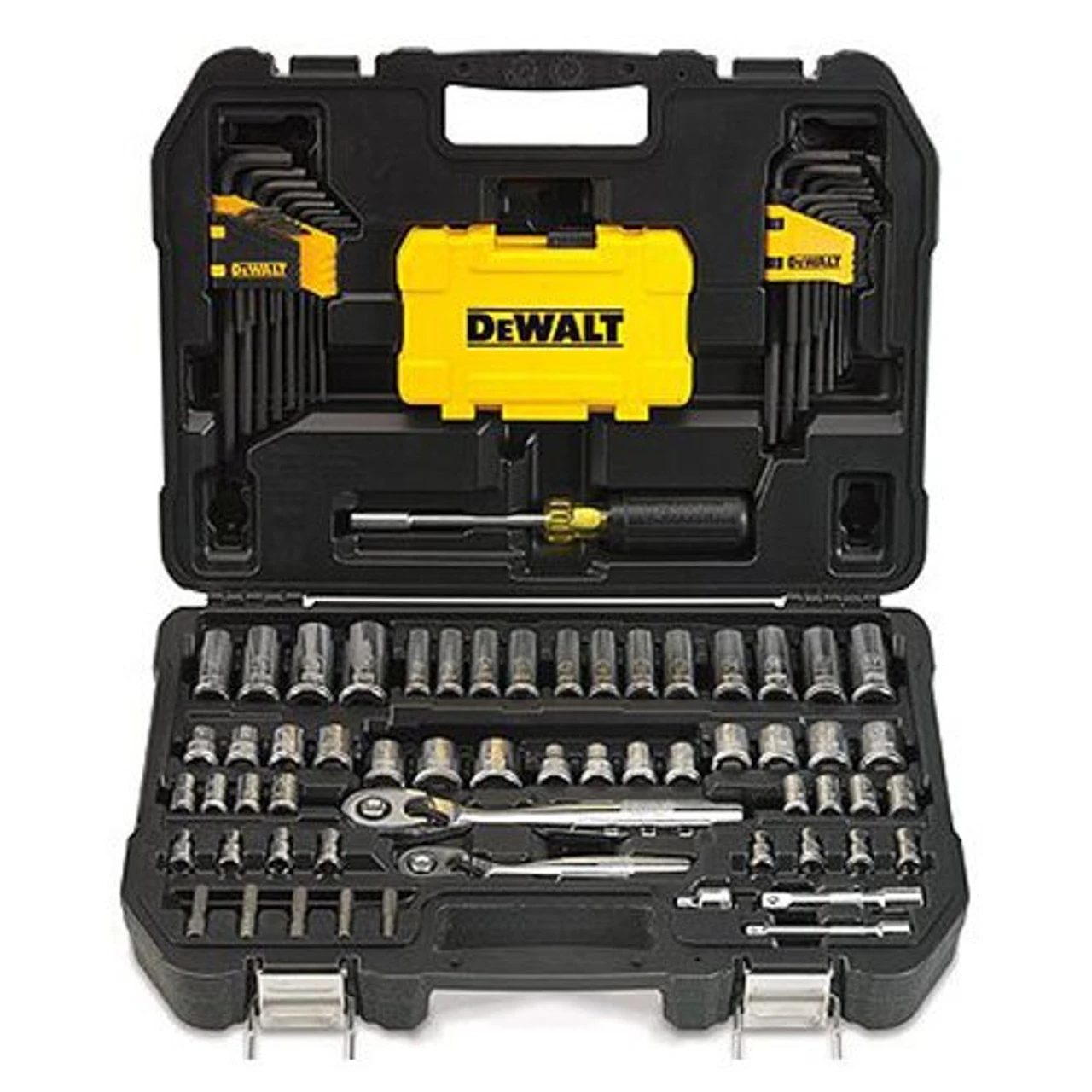 With the 108 Piece Mechanics Tool Set, you can be sure you have the right tool for the job. The set includes two Pear Head ratchets and a variety of sockets, extensions and adapters. The sockets include DirectTorque technology to help prevent rounding of fasteners and to provide better grip. FEATURES Removable Power Tools Accessory Case Quick Release, 72 Tooth Ratchet for high torque ratcheting Durable anti-slip vinyl grip bit driver with maximum comfort. Knurled control ring DirectTorqueâ„¢ Technology Polished chrome vanadium finish INCLUDES 1/4 in Drive 6pt sockets: SAE 5/32, 3/16, 7/32, 1/4, 9/32, 5/16, 11/32, 3/8, Metric 4, 5, 6, 7, 8, 9, 10, 11. 1/4 in Drive 3 in Extension 1/4 in Drive 6pt deep socket: SAE 11/32, 3/8, 7/16, 1/2, Metric 10, 11, 12, 13. 3/8 in Drive 6pt sockets: SAE 3/8, 7/16, 1/2, 9/16, 5/8, 11/16, 3/4, Metric 10, 11, 12, 13, 14, 15, 16, 17. 3/8 in Drive 6pt deep sockets: SAE 9/16, 5/8, 11/16, 3/4, Metric 14, 15, 16, 17. 3/8 in x 1/4 in Reducing Adapter, 3/8 in Drive 3 in Extension 1/4, 3/8 in Pear Head Ratchet 14 piece standard hex key set, 14 piece metric hex key set Nut driver bit: SAE 5/32, 3/16, 7/32, 1/4, 9/32. Vinyl grip multi driver, 22 piece bit set with storage case.