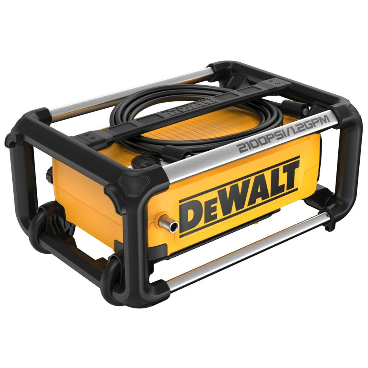 Power through outdoor cleaning jobs with the multi-use 2100 MAX psi 1.2 gpm 13 Amp Electric Jobsite Cold Water Pressure Washer. For convenience and quick accessibility, this Pressure Washer was designed with internal storage capability so you can seamlessly stow and retrieve the included wand and nozzles. This durable unit has a high-strength frame for stacking†and the self-contained, compact design makes the Pressure Washer 3X smaller‡. The design also gives you the freedom to store the unit vertically or horizontally. Simply place the hose securely under the main handle of the unit for low-hassle storage and transport. Accessories include a turbo nozzle for up to 2.4X cleaning width, 15° nozzle, 40° nozzle, a soap nozzle with wand storage, and a built-in removable soap tank for projects that require detergent for a full clean. This tool delivers the versatility to clean tools and equipment, along with decks, siding, sidewalks, boats, outdoor furniture, and vehicles. The Corded Cold Water Pressure Washer can easily be transported to the jobsite or around the home, weighing 24 lbs. with multiple grab points for loading and unloading, wheels, and a retractable handle. Features: TAKE ON A RANGE OF OUTDOOR CLEANING TASKS with up to 2100 psi and 1.2 gpm HIGH-ENDURANCE FRAME FOR STACKING†: Maximize your space with the self-contained design that allows for vertical or horizontal storage SIMPLIFIED ORGANIZATION: Dedicated storage for on-board nozzle, hose, cord, and wand HASSLE-FREE MOBILITY: Washer weighs only 24 lbs. for quick transport to the worksite with multiple grab points, retractable handle, and wheels CLEAN WITH DETERGENT by using the built in removable soap tank DURABILITY FOR LONG-TERM USE: Withstands heavy-duty usage with 25 ft. kink-resistant hose CLEAN SURFACES UP TO 35 FT. AWAY with power cord for long-range washing EXPERT-TESTED AND APPROVED: Cleaning Equipment Trade Association (CETA) Certified BACKED BY A 3-YEAR LIMITED WARRANTY: Work with confidence and peace-of-mind Specifications: AMPS: 13 AMPS CORD LENGTH: 35 FT DETGERGENT TANK TYPE: REMOVABLE FLOW RATE: UP TO 2.0 (AT 45 PSI)**** HOSE LENGTH: 25 FT INCLUDED NOZZLES: TURBO, 15°, 40°, SOAP MOTOR TYPE: UNIVERSAL OPERATING PRESSURE: UP TO 2100 PSI* (AT 1.2 GPM WITH 15° NOZZLE) PUMP TYPE: AXIAL CAM WHEEL SIZE: 4 IN Includes: (1) DWPW2100 Pressure Washer (1) Turbo Nozzle (1) 15° Nozzle (1) 40° Nozzle (1) Soap Nozzle (1) Wand (1) 25 ft. Hose