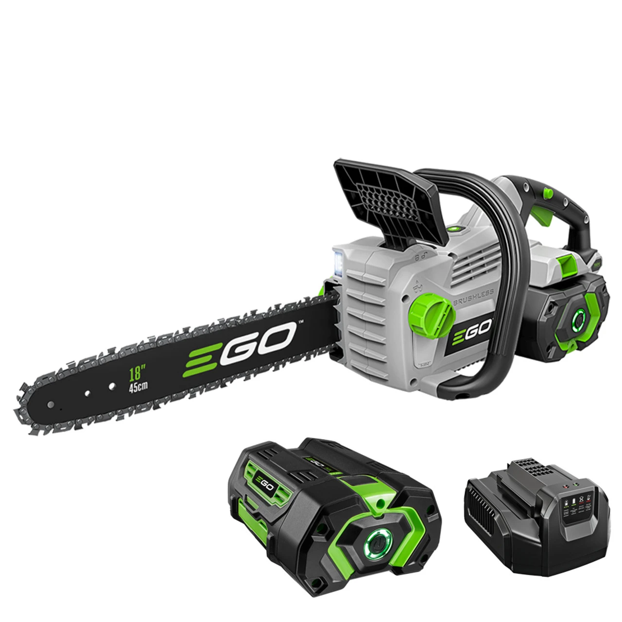 The EGO POWER+ 18” Chain Saw delivers the power and performance of a 45cc gas chainsaw without the noise, fuss, or fumes. Powered by any EGO POWER+ 56V ARC Lithium battery, this cordless chainsaw delivers up to 300 cuts on a 4×4 when used with the recommended 5.0Ah ARC Lithium battery. Its high-efficiency brushless motor delivers 11,000 RPM for clean, efficient cuts. Bright LED lights on the front of the chainsaw illuminate your cut when working at dusk or in emergencies without access to lights. The tool-free chain tensioning system on this electric chainsaw tightens your chain with the twist of a dial—no need to take anything apart to get your chain set properly. Its aggressive 18-inch bar and chain is designed for taking down large branches, stumps, and tall trees. Experience Power Beyond Belief without the noise, fuss, or fumes. Specifications 45CC gas equivalent Up to 300 cuts on a 4×4 with the recommended 56V 5.0Ah ARC Lithium battery 18-inch bar and chain Bright LED Lights illuminate your work area 11,000 RPM for clean, efficient cuts IPX4-rated weather-resistant construction Tool-free chain tensioning system tightens the chain with the twist of a dial Brushless motor extends the life of the tool 3/8-inch pitch, .050-inch gauge chain, 62 drive links 5-year tool warranty