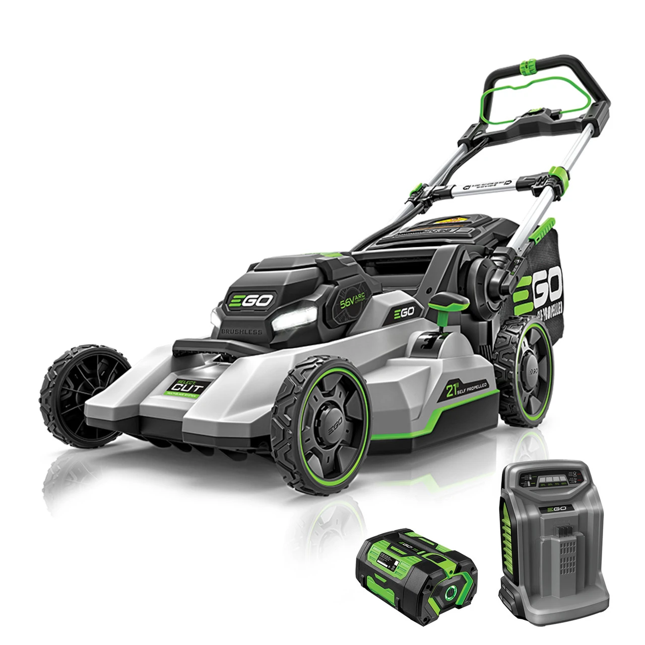 The EGO POWER+ 21″ Select Cut Self-Propelled Mower delivers performance that exceeds the power of gas. The Select Cut Multi-Blade Cutting System is equipped with three interchangeable lower blades: the Mulching Blade, High Lift Bagging Blade, and Extended Runtime Blade. The Mulching Blade comes installed on the lawn mower and is ideal for weekly mulching, giving you the mulching quality expected from a high-end gas lawn mower. The High Lift Bagging Blade provides extra suction ideal for bagging, leaving your yard free of clippings. The Extended Runtime Blade provides an optimal balance of cut quality and runtime for all around performance. All three blades can be used interchangeably based on your desired cut. The Upper Blade is used in combination with the lower blade chosen to slice the grass into fine fragments, greatly enhancing cutting performance with all grass types. EGO Touch Drive self-propelled technology puts complete control of the self-propel system in the palm of your hands by using pressure to engage the system. Easily control the variable speed with a dial positioned at your fingertips for safe and convenient operation. The Select Cut cordless lawn mower harnesses the power of the industry’s most advanced 56V ARC Lithium batteries to deliver up to 60 minutes of runtime on a single charge with the recommended 7.5Ah battery. Three-in-one functionality delivers your choice of mulching, side discharge, or bagging your grass clippings; an easy-access two-bushel grass collection bag is included. This electric lawn mower includes bright LED lights for added visibility when mowing at dawn or dusk, and it folds for compact storage between cuts. Experience Power Beyond Belief with the EGO POWER+ 21″ Select Cut Self-Propelled Lawn Mower. Specifications Select Cut multi-blade system delivers customizable cutting performance Touch Drive self-propelled technology puts complete control in the palm of your hands Up to 60 minutes of runtime on a single charge with the recommended 56V 7.5Ah ARC Lithium battery High-efficiency brushless motor delivers long runtimes, low vibration, and lifelong durability Variable speed self-propel: .9 MPH – 3.1 MPH 7-position cutting height adjacent : 1.5 inches to 4 inches 3-in-1 function: mulching, bagging, side discharge Quick and easy push-button start 21-inch deck Bright LED headlights One-handed height adjustment IPX4-rated weather-resistant construction Folds for compact storage Easy-access two-bushel grass collection bag Includes Mulching Blade, High Lift Bagging Blade, Extended Runtime Blade, and Upper Blade 60-minute charging time with the recommended 7.5 Ah ARC Lithium battery and POWER+ Rapid Charger Compatible with all EGO 56V ARC Lithium batteries 5-year tool warranty, 3-year battery warranty Includes LM2130SP MOWER CH5500 POWER+ RAPID CHARGER BA4200T POWER+ 7.5 AMP HOUR BATTERY WITH FUEL GAUGE