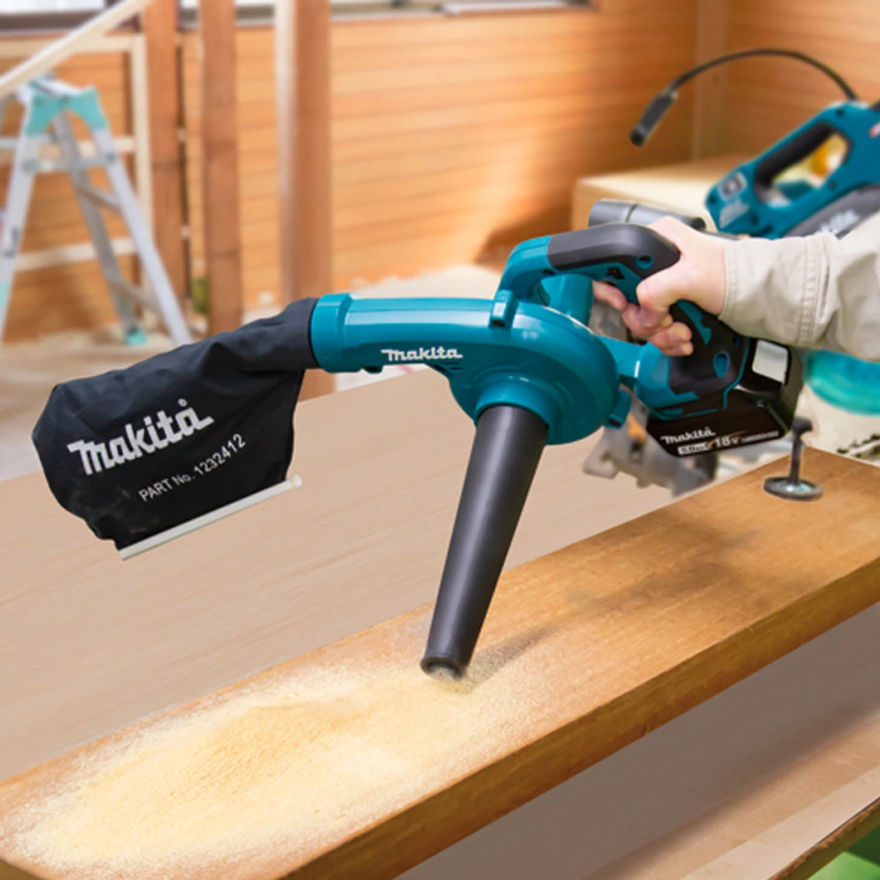 Increased max. air volume, air speed and sealed suction for improved performance and efficiency High / medium / low speed settings with variable speed trigger allows operator to use the precise amount of air for the application Converts quickly and easily to a vacuum using vacuum bag part no. 123241-2 Ergonomic soft rubber grip design for vibration absorption and comfortable operation Use with Long Garden Nozzle 191G09-6 for easy operation while standing INCLUDES: Tool Only. Batteries and Charger Sold Separately. Nozzle Assembly (123245-4) SPECIFICATIONS Battery Capacities: 18V Li-Ion Maximum Air Volume 113 CFM (3.2 m3/min) Maximum Air Velocity 219 MPH (98 m/sec) Maximum Air Pressure 5.8 kpa (590 mm H2O) No Load Speed 0 – 18,000 RPM Vibration Level 2.5 m/s2 Noise Level 83 dB(A) Overall Length 20-3/8″ (517 mm) Net weight 2.9 lbs (1.3 kg)