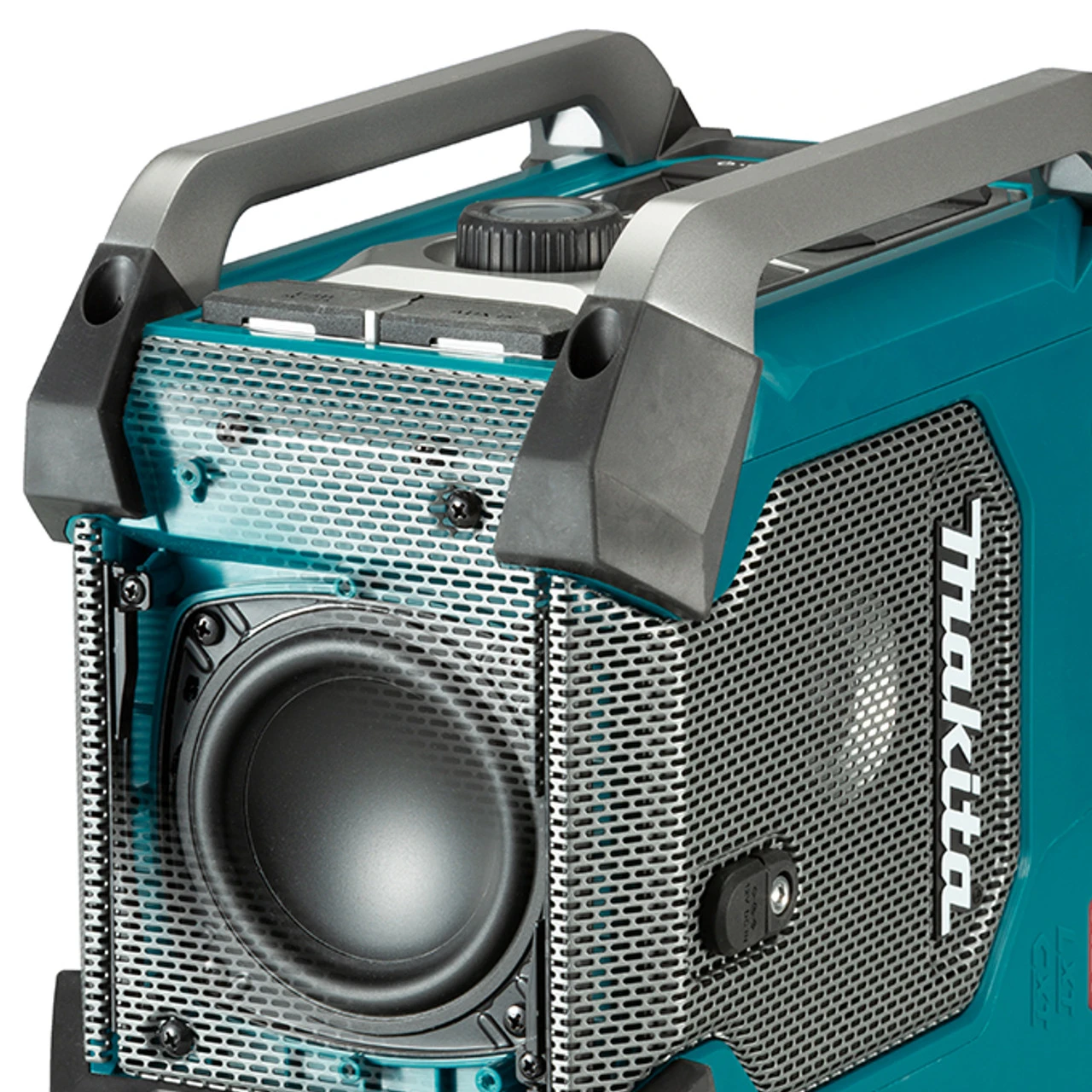 Compatible with Makita 40V MAX XGT / 18V LXT / 12V CXT Batteries or AC Power Bluetooth®, IP65 Rated, Integrated subwoofer, Adjustable Equalizer Equipped with Bluetooth® 5.0 to wirelessly connect your mobile device to play music 2 Side firing speakers deliver stereo sound and a dedicated bottom firing subwoofer for deep and rich audio quality 7 pre-set equalizer modes with LED colour indication to optimize sound output according to audio genre MYEQ feature allows for independent adjustment of Treble, Midrange and Bass Dust and water-resistant construction (IP65 rated) for improved operation in harsh job site conditions Rugged design with expanded rubber bumpers and front metal guard for maximum protection on the jobsite Folding carry handle with soft rubber grip and built in FM antenna for easy transportation USB port enables convenient charging of mobile devices Illuminated controls and dial for improved visibility in darkly lit spaces Adjustable sleep timer with auto shut off feature and alarm function Digital AM / FM tuner with LCD backlit display and 10 pre-sets (5 AM / 5 FM) AUX-IN port for connecting to an external audio source Runs up to 19 hours on a single charge with 40V MAX XGT (4.0 Ah) battery INCLUDES: Tool Only. Batteries and Charger Sold Separately. AC Adapter (SE00000681) Battery Capacities: 40V MAX XGT, 18V LXT, 12V MAX CXT Li-Ion