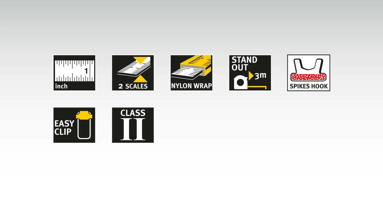 You will be impressed by the STABILA pocket tape BM 300: exceptional stability combined with the highest level of user comfort. This tape measure sits ideally in your hand and is outstanding in everyday use thanks to the shatterproof housing and the hard-wearing blade coating. The STABILA SPIKES hook ensures a secure hold on work pieces and reading off measurements is particularly easy with scales on both sides of the blade. The rounded STABILA EASY-CLIP ensures that the tape measure is particularly easy on belts and pants pockets. A well-designed tool and perfect companion for every professional needing to measure with precision. Features: Extremely robust pocket tape with imperial scale. Shatterproof PC/ABS housing with shock-absorbing soft grip casing protects the blade against hard knocks. Curved brake switch enables comfortable actuation of the push brake for controlled blade stopping and locking. Rounded STABILA EASY-CLIP for easy attachment to your belt. Extremely resistant STABILA NYLON-WRAP coating protects the blade against corrosion and wear. Tape measure with thick material for high stability and rigidity – can be extended to 10’ without buckling. STABILA SPIKES coating improves protection against slipping. Extra-large hook enables hooking into various measuring positions. Integrated eyelet in the hook prevents the blade from slipping. Scales on both sides for ideal readability. Imprinted 16″ and 19.2” stud markers simplify work with post and beam constructions. Equipped with a strong spring for automatic, powerful blade retraction. Applications: Pocket tapes are essential measurement tools for everyday work – for all professionals who calibrate, take measurements, cut materials to length or check lengths.