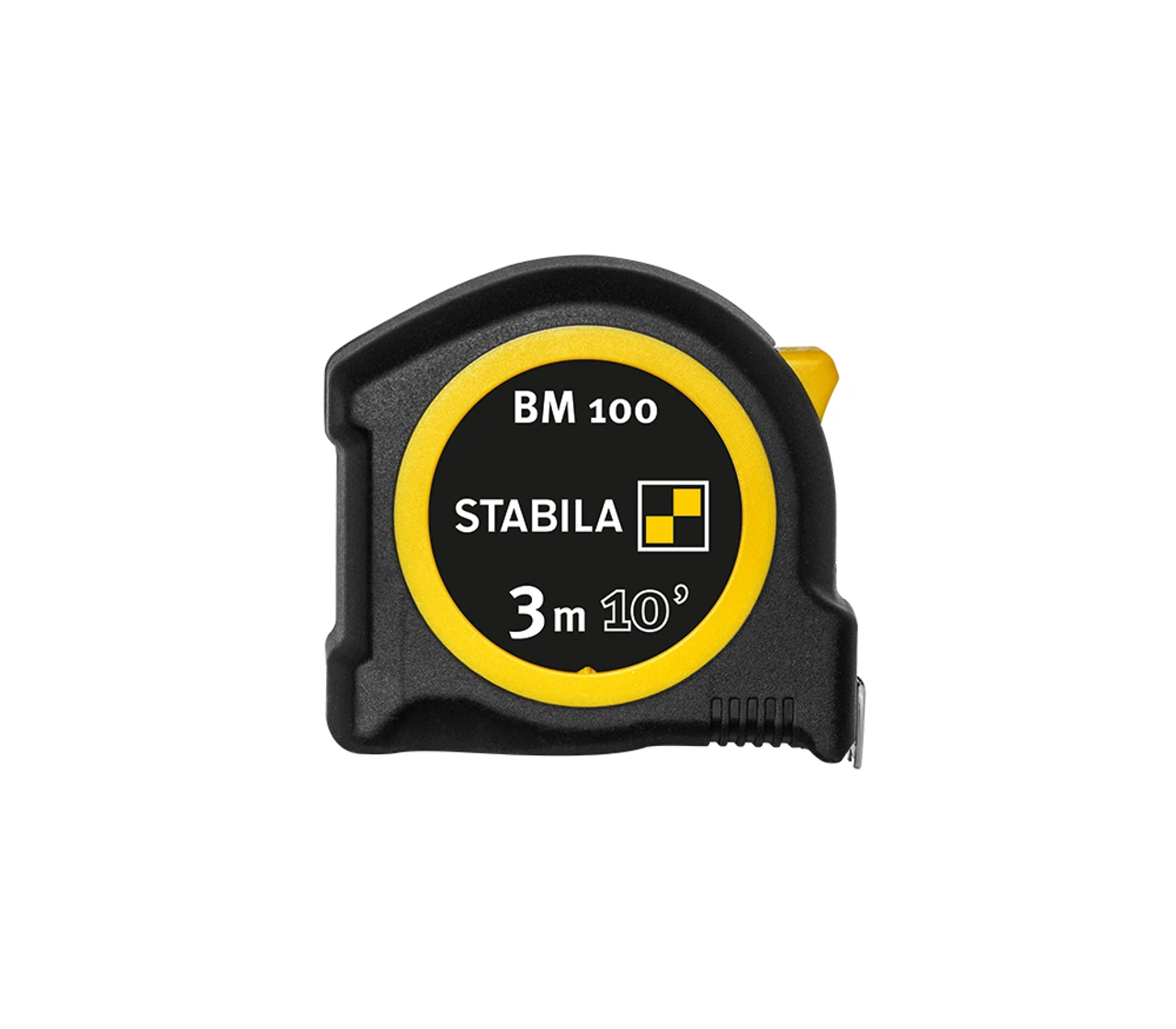 Description:Do you have to measure multiple lengths every day? Then this tape measure should be your reliable, always close at hand companion throughout your workday: Thanks to its compact design and low weight, the BM 100 fits particularly well in your hand. The soft grip casing provides a firm grip and absorbs the shock upon impact in case it drops. The precisely readable scale makes it easier to mark objects. Tough enough for use on construction sites, its design is complemented by a strong brake and powerful blade retraction mechanism. Yet another sound tool from STABILA at an attractive price. Features: Compact pocket tape with a cm/inch scale. Non-breakable ABS case with a shock-absorbent soft grip cover protects the blade from impacts. Ergonomic tape capsule for optimal handling. Convenient brake button for easily pressing the push brake to stop or lock the blade. Chrome-plated metal clip for easy attachment to your belt. An eyelet integrated into the housing for attaching a wrist strap to prevent drops. Robust coating protects the scale against wear. Yellow blade coating ensures optimal readability even in bright sunlight. Red tens for quick orientation and reading. Imprinted 16″ and 19.2″ stud markers make it easier to work with stand mounts. Start of the blade reinforced with a metal plate to prevent wear. Adjustable starter hook for precise measurements. An eyelet integrated in the hook prevents the blade from slipping. Equipped with a strong spring for automatic, powerful blade retraction. A gentle cushion on the blade return protects the hook. Applications: Pocket tape measures are essential tools for all craftsmen and handymen in their daily work: taking measurements, calibrating, cutting material to size and checking lengths.