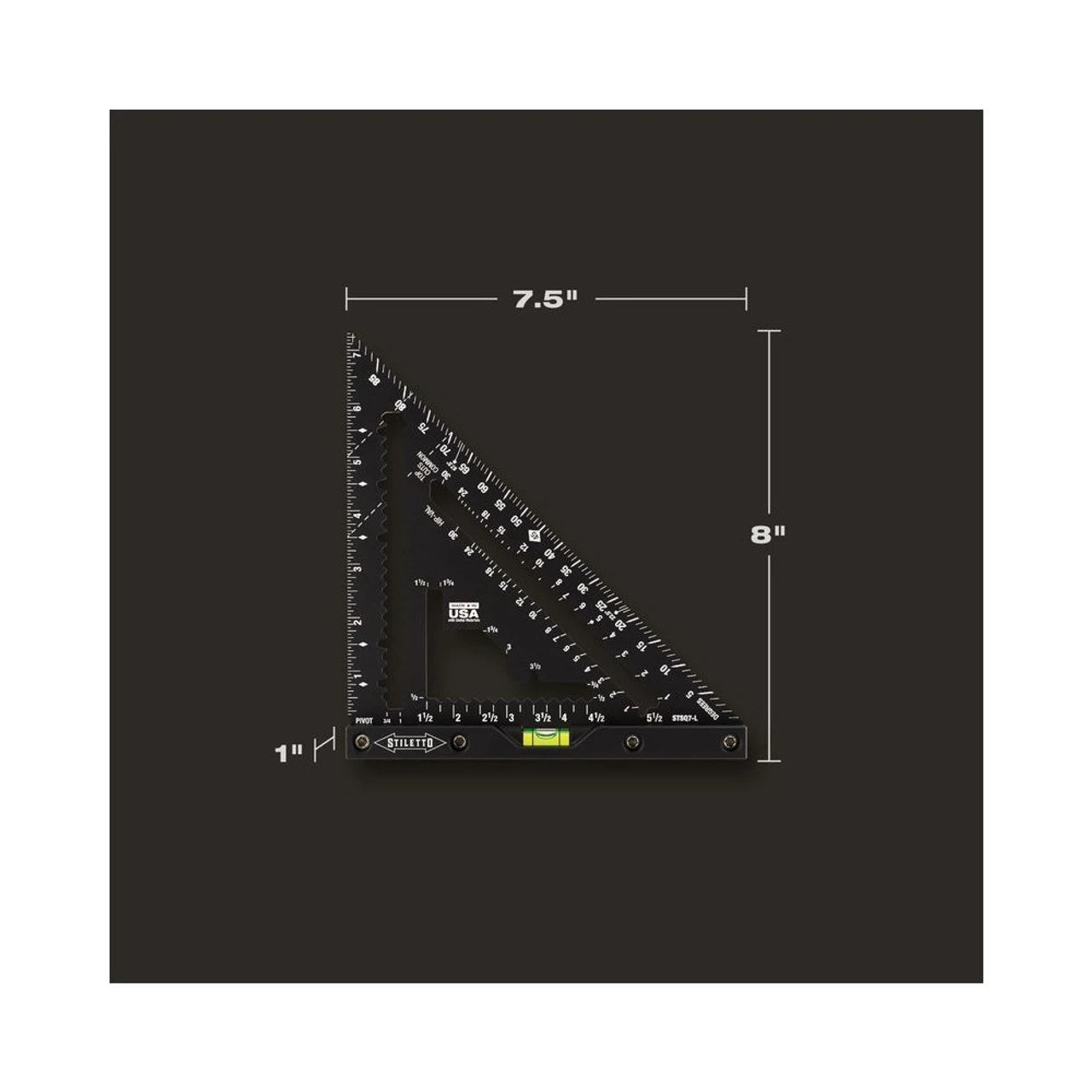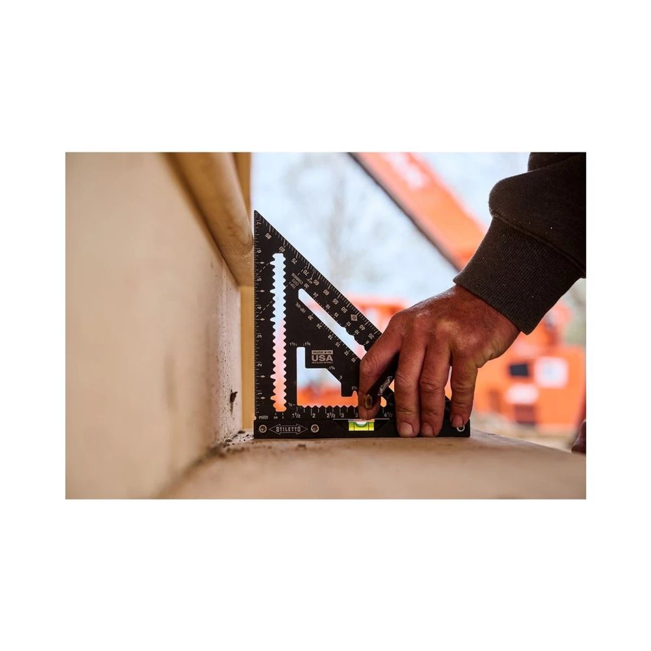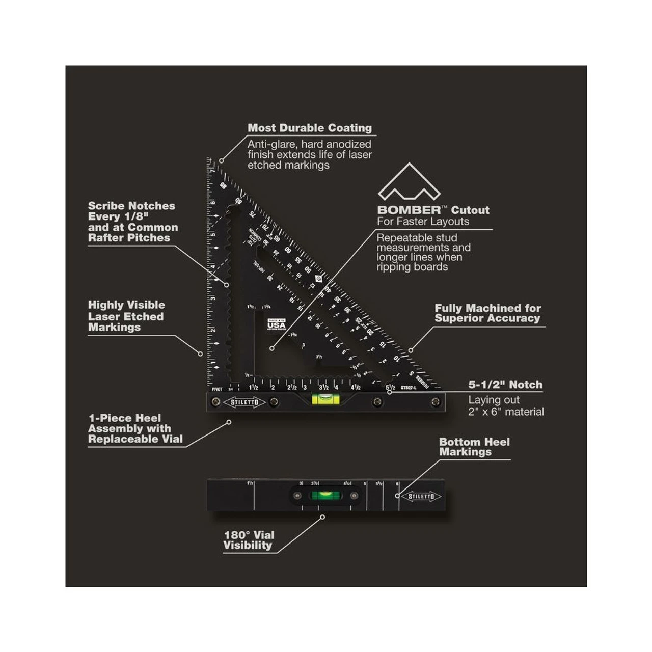 The STILETTO 7in Carpenter Square with Level is designed with more layout notches to help build and level faster. Additional notches aid in laying out 2×6 material, ripping boards, and marking rafter pitches. The BOMBER Cutout allows for repeatable stud measurements, while the bottom heel markings provide marking versatility. The 7in Carpenter Square with Level also features a replaceable 180 degree vial. This square is fully machined, with an anti glare finish and the most durable coating. Features BOMBER Cutout for Faster Layouts – Repeatable Stud Measurements for 1-1/2, 3, 4-1/2, and LVL Most Durable Coating- Anti-Glare, Hard Coat Anodized Finish Extends Life of Laser Etched Markings Fully Machined for Superior Accuracy 180 degree Vial Visibility Bottom Heel Markings Highly Visible Laser Etched Markings 5 1/2in Notch for Laying out 2×6 Material Use BOMBER to Layout Longer Lines when Ripping Boards- 1/2in, 3/4in, 1 3/4in 1-Piece Heel Assembly with Replaceable Vial