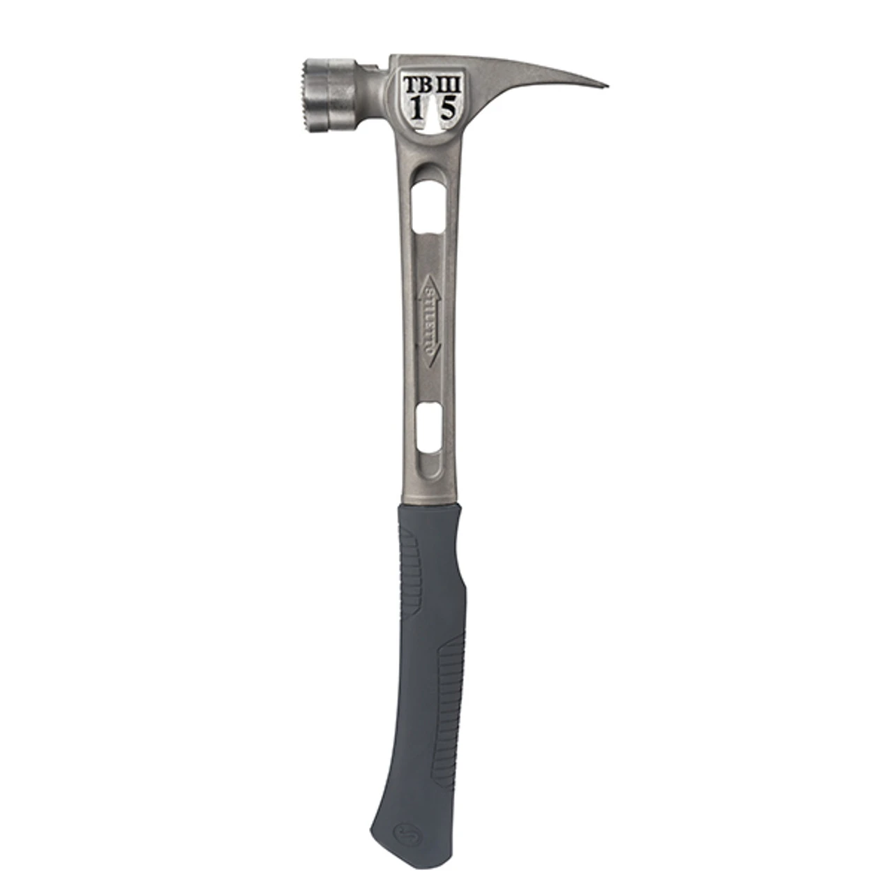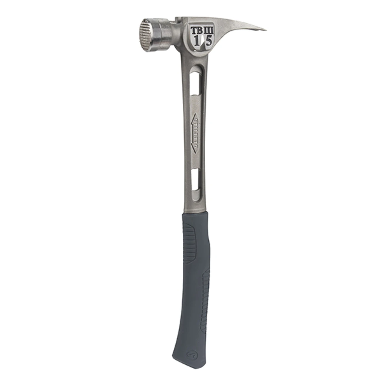 The STILETTO 15oz. Ti-BoneIII Milled Face Hammer with an 18in. Curved Handle is powerful, painless & lightweight. The Hammer has a 180° side nail puller that eases 16p nails out in one motion, along with and Stiletto’s signature magnetic nail starter. The TiBoneIII drives like a 28 oz. Steel hammer and is recommended for Pole barn, Concrete, Framing and Remodeling. The newly designed anti-rotational face, which prevents the face from coming loose during use. The durable grip will not peel or crack. Titanium is 45% lighter weight while providing the same striking force and strength as steel. Titanium tools also produce 10 times less recoil shock which helps reduce carpal tunnel syndrome. The combination of these features means less down time, more productivity and most importantly less pain while working.