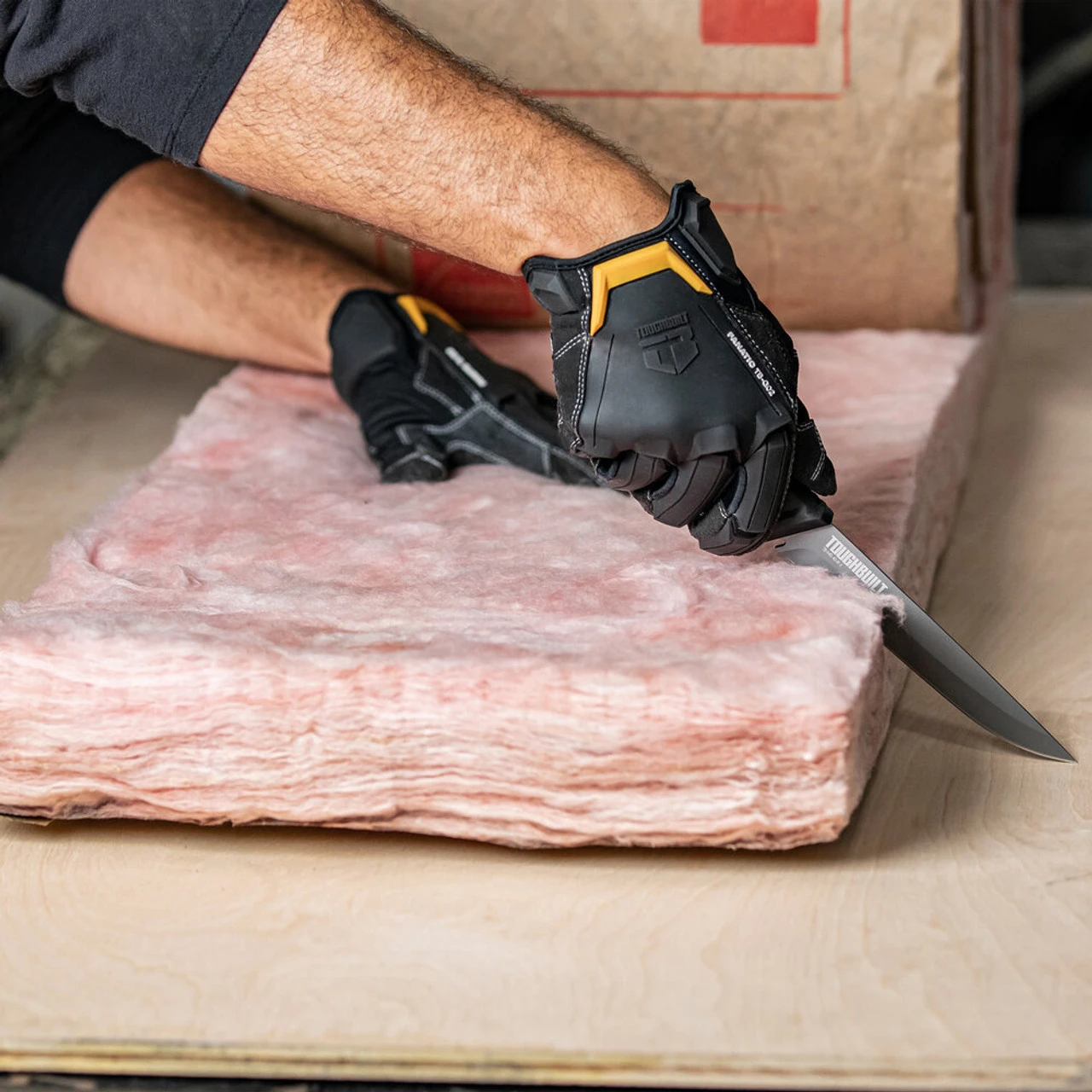 The ToughBuilt Insulation Knife + Sheath is designed for optimal edge retention and durability. The titanium-coated stainless steel blade is engineered to stay sharper up to 2X longer when cutting mechanical and HVAC insulation. A full metal tang provides durability for tough cuts day after day. The durable molded sheath provides easy carry and storage. This hard-working knife keeps up with the rigorous demands of the pro and is backed by our Full Lifetime Warranty. Features & Benefits 6″ titanium coated stainless steel blade Full Lifetime Warranty Includes heavy-duty sheath with belt clip Full tang for lasting durability Ergonomic, soft-touch handle Lanyard Hole