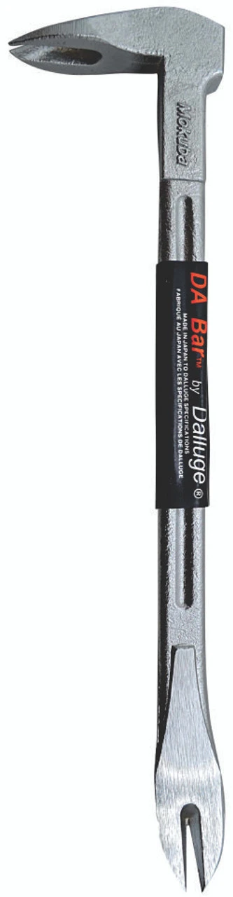 These popular Da Bar Nail Puller Bars were created in Japan to Dalluge Tools’ highest specifications and are ideal for removing molding and trim work. The 04200 measures 8 inches. Thinner and lighter than traditional Japanese bars, Da Bars feature flat claws that slip easily under nail heads to minimize damage to wood surfaces. Forged and tempered for strength, the rocker head provides excellent leverage while the body has rounded edges for comfort and safety. All Dalluge Da Bars have a chrome finish. MADE IN JAPAN. FEATURES: Nail puller perfect for removing trim and molding Compact body is thinner and lighter than similar nail pullers Forged and tempered for strength and durability Flat claws reduce damage to wood surfaces Rocker head improves leverage Body has rounded edges for an easier grip Chrome finish      Â