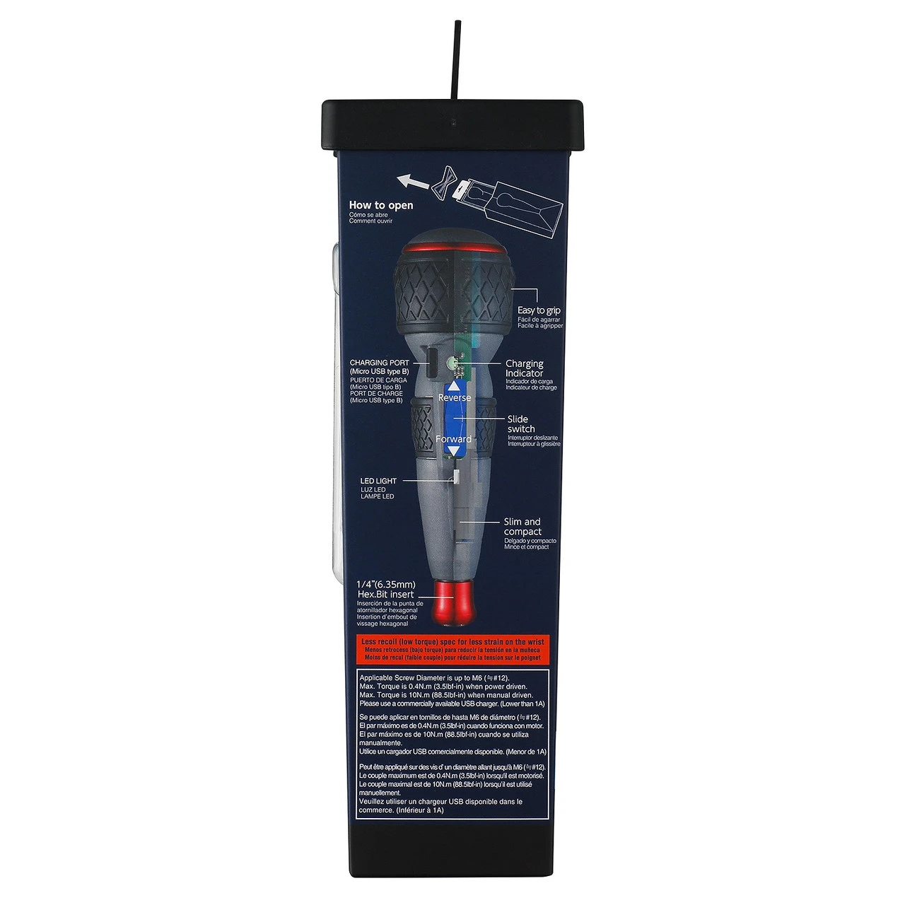 VESSEL’s Best Selling Product in Japan is Finally Coming to CanadaThe 220USB-1U cordless rechargeable Ball Grip screwdriver provides high torque needed for jobs in narrow spaces, assembly work, electrical work, MRO and more. FEATURES Forward/Reverse switch LED Illuminates work area 1200 RPM (MAX/no-load) 3.5 ib/in torque (electric) 88.5 ib/in (manual) 3.6V Lithium-Ion battery Weighs only 5.6oz INCLUDES: Ball Grip Rechargeable Screwdriver +2 x 3.5″ IMPACT Torsion Bit USB Charging Cable (3ft) SPECIFICATIONS Battery Capacity: Li-Ion 3.6V 800mAh No-Load RPM (Max): 1200 RPM Torque (Max): 3.5 Ibf-in (0.4 N.m) [Power Driven] Applicable Torque: 88.5 Ibf-in (10 N.m) [Manual Driven] Sleeve: Aluminum sleeve chuck with ball lock Applicable Bit: 1/4″ Hex, Single-End or Double Ended Bit Battery Charger: Input 100-240VAC, 50/60Hz Output 5V 1A Charging Time: Approx. 60 min. Number of Rechargeable Times: Approx. 500 times Continuous Use Time: Approx. 40 min. (no-load) Number of Screw Tightening: Approx. 200 times (M4x20mm) Charging Method: Mirco USB-type B, USB Charging Input (Max): 5V 1A Weight (Accessories not Included): 0.85 lbs Operation / Charing Environment: 14°F – 113°F / 32°F – 104°F