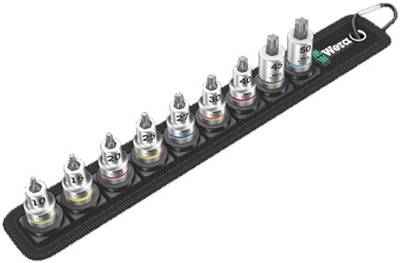 Features: 9-piece bit-socket set on a robust textile belt, 3/8″ Bit-sockets with all the advantages of the Wera bit technology Bit-sockets with holding function for screws/bolts Smooth Twist to Unlock mechanism for a secure fit and simple removal of the sockets Suitable for attachment to a wall, shelf, tool trolley and to the Wera 2go System Typically Wera designed robust textile belt with 9 sockets taking up minimal space. A smooth Twist to Unlock mechanism ensures a secure fit and simple removal of the sockets. Comes with “Take it easy” Tool Finder with colour coding according to size to enable the right tool to be selected easily and quickly. Includes a snap hook for secure fastening to a belt loop or pocket. Especially short, stable bitsockets with all the advantages of the Wera bit technology. Bit sockets with holding function for particularly convenient screwdriving with reduced risk of losing the screw when approaching the workpiece. Supplied with a nonwoven reverse side and hook and loop strips for simple attachment e.g. to a wall, shelf, tool trolley and to the Wera 2go tool transport system. Includes: 8767 B HF TORX Zyklop bit socket with holding function, 3/8″ drive, TX 10 x 35 mm 05003059001 1x TX 10 x 35 mm 05003060001 1x TX 15 x 35 mm 05003061001 1x TX 20 x 35 mm 05003062001 1x TX 25 x 35 mm 05003064001 1x TX 27 x 35 mm 05003066001 1x TX 30 x 35 mm 05003068001 1x TX 40 x 35 mm 05003070001 1x TX 45 x 38.5 mm 05003072001 1x TX 50 x 38.5 mm Belt B (textile belt), 9 location, unloaded, 45 x 310 mm 1x 45 x 310 mm Hook and Loop Fastener Strips 30, 30 x 200 mm 1x 30 x 200 mm Wera Belts Whoever would have thought that the storage of sockets could be completely revolutionized and that someone could come up with a stylish belt with securely attached sockets that can still be easily removed. Bit sockets with holding function for TORX screws The HF tools developed by Wera are ideal because they feature an optimized geometry of the original TORX profile. The wedging forces resulting from the surface pressure between the drive tip and the screw profile mean that TORX screws made according to Acument Intellectual Properties specifications are securely held on the tool! Manual and machine sockets The manual and machine sockets can be used both for hand and power tools use (non-impact). Users need just one socket set for all applications. Take it easy tool finder system Take it easy tool finder system – with profile and size colour-coding for quick and easy tool selection. Colour-coded system for hexagon drive screws (L-Keys, Zyklop bit sockets), external hex drive screws and nuts (Joker wrenches, Zyklop sockets and Zyklop bit sockets with holding function), and TORX drive screws (L-Keys, Zyklop bit sockets). Secure hold and easy removal The all new smooth turning mechanism guarantees both secure and rattle-free storage, yet allows easy removal of the tool. Practical nonwoven strips The textile belt can be attached by means of the nonwoven reverse side and the hook and loop strips e.g. to a wall, shelf, tool trolley and to the Wera 2go tool transport system. Comes with convenient snap hook The robust textile belt can be secured to a belt loop or pocket by means of the snap hook.