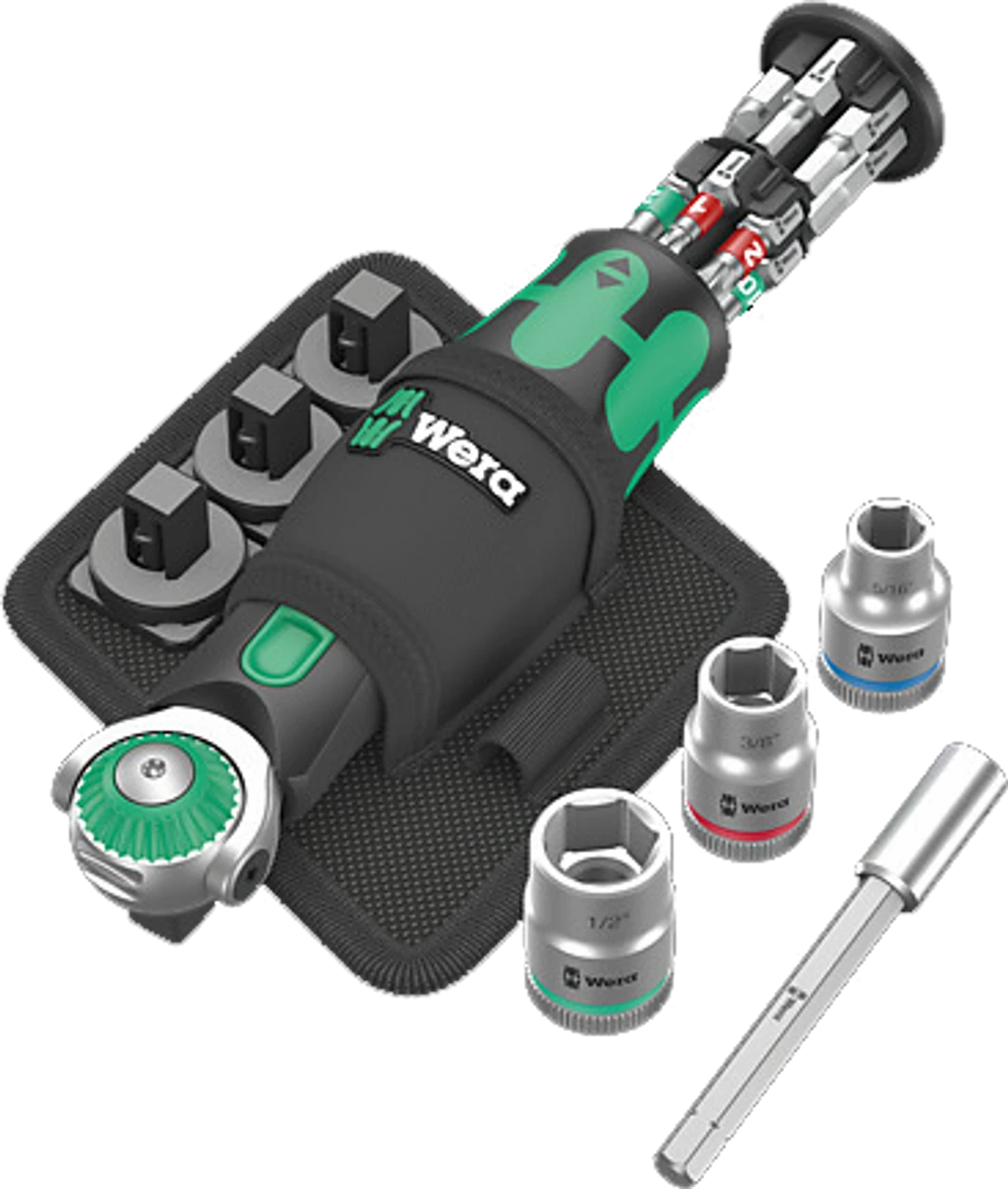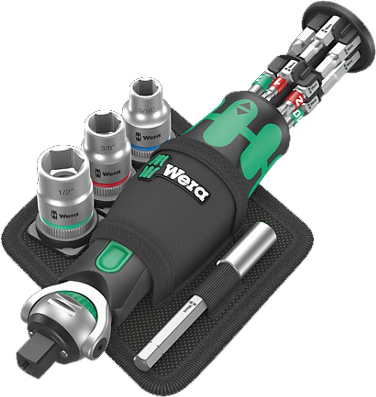 Compact Zyklop ratchet with bit magazine for the pocket. Magnetic direct mounting for ¼” bits and 3/8″ sockets. Rapid tool changethanks to the non-locking mounting. As the head is lockable at 0°, 15° and 90°, the tool can be used as a ratchet and as a ratchetscrewdriver. The fine toothing with 72 teeth allows for a low return angle of 5°. Wide range of applications thanks to 12 bits integratedin the handle. The robust ratchet mechanism allows for ample torque. Perfect combination of a Zyklop ratchet with a 12-piecescrewdriver set. The 75 mm long universal holder for 1/4″ bits can be used as an extension. Including sockets in the commonestdimensions. One robust textile holster 9468 to be attached to the belt and docked onto the Wera 2go system. FEATURES: Compact Zyklop ratchet with integrated bit magazine Thanks to it’s clever design the ratchet head doubles up as both a 3/8″ square drive ratchet for sockets, and integral 1/4″ hexagon drive for screwdriver bits Freely pivoting ratchet head with 5 predefined locking positions Fine tooth reversible ratchet (72 teeth) for a low return angle of only 5° Captive and freely swiveling bit magazine for easy removal and secure storage of the bits Universal holder with stainless steel sleeve and strong permanent magnet, can be used as extension Robust textile holster to be attached to the belt and docked onto the Wera 2go system INCLUDES: 8009 Zyklop Pocket, 3/8″ x 1/4″ x 133 mm 893/1/1 Universal Bit Holder, 1/4″ x 75 mm 851/1 BTZ bits, PH 1 x 25 mm 851/1 BTZ bits, PH 2 x 25 mm 867/1 BTZ TORX bits, TX 10 x 25 mm 867/1 BTZ TORX bits, TX 15 x 25 mm 867/1 BTZ TORX bits, TX 20 x 25 mm 867/1 BTZ TORX bits, TX 25 x 25 mm 840/1 Z bits, 1/8″ x 25 mm 840/1 Z bits, 5/32″ x 25 mm 840/1 Z bits, 3/16″ x 25 mm 840/1 Z bits, 1/4″ x 25 mm 868/1 Z Square-Plus bits, # 1 x 25 mm 868/1 Z Square-Plus bits, # 2 x 25 mm 8790 HMB Zyklop 3/8″ socket, 5/16″ x 29 mm 8790 HMB Zyklop 3/8″ socket, 3/8″ x 29 mm 8790 HMB Zyklop 3/8″ socket, 1/2″ x 29 mm 9468 Zyklop Pocket holster, empty, 155 x 65 mm