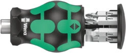 Particularly small bit holding screwdriver with short bit mounting for hard to reach areas. Includes 6 bits, which are located in a magazine in the handle. With only 65mm total length, the Kraftform Kompakt Stubby is a real mini screwdriving workshop. The strong permanent magnet in the bit mounting ensures secure holding of the bit. The 2-component handle with the practical combination of hard and soft zones allows for a firm grip and precise working. Tough viscous bits for universal use. FEATURES: Short, compact Stubby shape for working in tight installation spaces, with 6 bits in the integrated magazine Ergonomic 2-component Kraftform handle for precise work 1/4″ bit mounting with strong permanent magnet Captive and swiveling bit magazine for easy removal and safe storage of bits Tough viscous bits for universal use INCLUDES: (1)Â Stubby Driver (05008878001) (1) Straight 1 x 5.5 x 25mm (05072059001) (1) Straight 1.2 x 6.5 x 25mm (05072061001) (1) PH #1 x 25mm (05072070001) (1) Ph #2 x 25mm (05072072001) (1) Square #1 x 25mm (05066405001) (1) Square #2 x 25mm (05066410001) Handle with integrated bit magazine The handle can be opened and thus gives access to the six bits contained in the magazine. Compact shape With its compact handle shape and the short blade, the Kraftform Stubbies are particularly suitable for working in confined screwdriving situations. Swiveling bit magazine The swiveling bit magazine allows for the bits to be removed easily in almost any situation and cannot be lost. The bits are safely stored. Bit holder with magnet The magnet ensures that the bit is securely seated in the holder. Tough-absorbing bits Tough-absorbing Wera bits (Z) prevent any premature breakage of the drive tip.