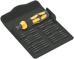 Textile box with 1 impact screwdriver 921 and 18 impact screwdriver bits (70 mm length) 19-piece set The impact screwdriver 921 combines the advantages of manual impact wrenches, compact tools and screwdrivers with pound-thru blade. The impact wrench function offers a loosening moment of up to 25 Nm. The robust bit holder allows the mounting of different specialized bits for various screw profiles. The pound-thru blade ensures complete power transmission (zero loss). The impact wrench function and screwdriver function can be switched as required. Features Compact and robust interchangeable blade screwdriver set with manually activatable impact wrench function For loosening stubborn screw connections Hammer blow impulse is converted into a rotary movement with a loosening torque of approx. 25 Nm – without loss via a pound-thru blade Reversible functions: impact wrench and screwdriver Specially hardened and extra tough bits with 1/4″ external hexagon drive Combines the advantages of manual impact wrenches, compact tools and screwdrivers with pound-thru blade Includes 921 Kraftform Plus Impact Screwdriver 851 S Phillips: #1, #2, #3 x 70mm 855 S Pozidriv: #1, #2, #3 x 70mm 867 S Torx: T15, T20, T25, T30, T40 x 70mm 840 S Hex-Plus: 3.0, 4.0, 5.0, 6.0 x 70mm 800 S Slotted: 0.8 x 4.0, 1.0 x 5.5, 1.2 x 6.5 x 70mm Hook and Loop strip: 120 x 50mm Durable textile storage case