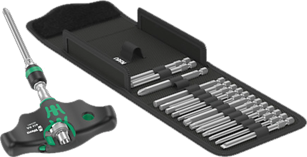17-piece set in a robust textile box. One 416 RA T-handle bitholding screwdriver with ratchet function and Rapidaptor quick-release chuck for ¼” bits. The integrated ratchet with fine toothing (80 teeth/return angle 4.5°) eases and accelerates screwdriving without having to reposition the tool. The ratchet mechanism completely embedded in the handle ensures very handy and comfortable work. With reversing lever for comfortable clockwise/counterclockwise direction change in one-hand operation. The ergonomic shape of the handle fills the ball of the hand well, the fingers lie securely in the softly rounded recessed grips. The whole hand comes into contact with the handle, friction loss between hand and handle is avoided. Bit holder for bits with 1/4″ external hexagon drive as per DIN ISO 1173-C 6.3 and E 6.3. With Rapidaptor technology for lightning-fast bit changes. 16 tough bits, ¼”, 89 mm long, for universal use. FEATURES: The integrated ratchet with fine toothing ensures fast and safe working Convenient working thanks to the ratchet mechanism fully embedded in the handle Reversing lever for comfortable clockwise/counterclockwise direction change Rapidaptor bit holding screwdriver with fast-rotating sleeve for lightning-fast bit changes and high working speeds Fast-rotating sleeve for extremely high working speed Ergonomic 2-component handle with finger handle recesses and pleasant surface feel for very high power transmission and fatigue-free working For bits with 1/4″ external hexagon drive as per DIN ISO 1173-C 6.3 and E 6.3 INCLUDES: 416 RA T-handle bitholding screwdriver with ratchet function and Rapidaptor quick-release chuck, 1/4 x 45 mm 851/4 Z bits, PH 2 x 89 mm 851/4 Z bits, PH 3 x 89 mm 867/4 Z TORX bits, TX 10 x 89 mm 867/4 Z TORX bits, TX 15 x 89 mm 867/4 Z TORX bits, TX 20 x 89 mm 867/4 Z TORX bits, TX 25 x 89 mm 867/4 Z TORX bits, TX 30 x 89 mm 867/4 Z TORX bits, TX 40 x 89 mm 840/4 Z bits, 1/8″ x 89 mm 840/4 Z bits, 5/32″ x 89 mm 840/4 Z bits, 3/16″ x 89 mm 840/4 Z bits, 7/32″ x 89 mm 840/4 Z bits, 1/4″ x 89 mm 868/4 Square-Plus bits, # 2 x 89 mm 868/4 Square-Plus bits, # 3 x 89 mm 800/4 Z bits, 1 x 5.5 x 89 mm Hook and Loop Fastener Strip 120, 120 x 50 mm Â