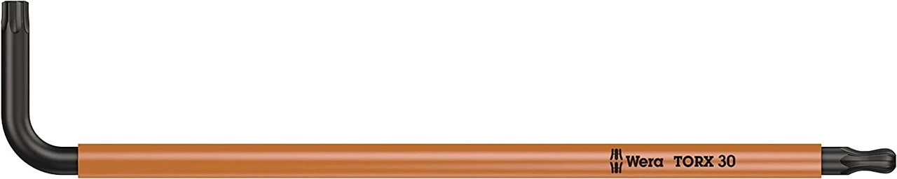 L-keys with thermoplastic sleeve (SPKL) out of easy-to-grip circular material. The sleeve ensures that work is pleasant and easy on the fingers even at low temperatures. All L-keys are quickly to hand thanks to their colour coding and size markings. The wear-resistant clip material ensures secure storage of the L-keys as well as simple removal. For TORX and TORX BO (with bore hole) connections. Features: L-keys for TORX BO screws to loosen safety connections Color coded, easy-to-grip plastic sleeve, even at low temperatures Black Laser tempered offers optimum surface protection for a long service life The ballpoint allows offset working Wear-resistant inscription of the sizes of the L-keys contained on the clip L-key for TORX socket screws with safety pin TORX tools with a borehole prevent the unauthorised unfastening of safety screws. The screws contain a pin that protrudes into the drive profile so that “normal” TORX tools cannot be used. This pin fits into the borehole of TORX BO tools allowing safety screws to be unfastened. The spherical drive profile means that it is possible to swivel the axis of the tool to that of the screw, and therefore enable angled, “around-the-corner” screwdriving jobs. For recessed screws, it’s often advantageous for the screw to be held on the L-key by magnetic force. The Wera clips with magnetiser/demagnetiser enable a magnetisation/demagnetisation of L-keys in a flash. The size of each L-keys has been engraved by a laser. In addition Take it easy L-keys have a colour coding according to sizes – for simple and rapid accessing of the required tool. Making it easy to find the right tool. The wear-resistant clip material ensures that the L-keys are securely held yet are easy to remove. Includes: 967 SPKL TORX BO L-key Multicolour, TX 9 x 79 mm 05024351001* 1x TX 9 x 79 mm 05024350001* 1x TX 8 x 76 mm 05024352001** 1x TX 10 x 85 mm 05024353001 1x TX 15 x 90 mm 05024354001 1x TX 20 x 96 mm 05024355001 1x TX 25 x 104 mm 05024357001 1x TX 30 x 122 mm 05024358001 1x TX 40 x 132 mm 05024356001 1x TX 27 x 112 mm * Product without bore hole at the short and without ball-end at the long arm ** Product without ball-end at the long arm.