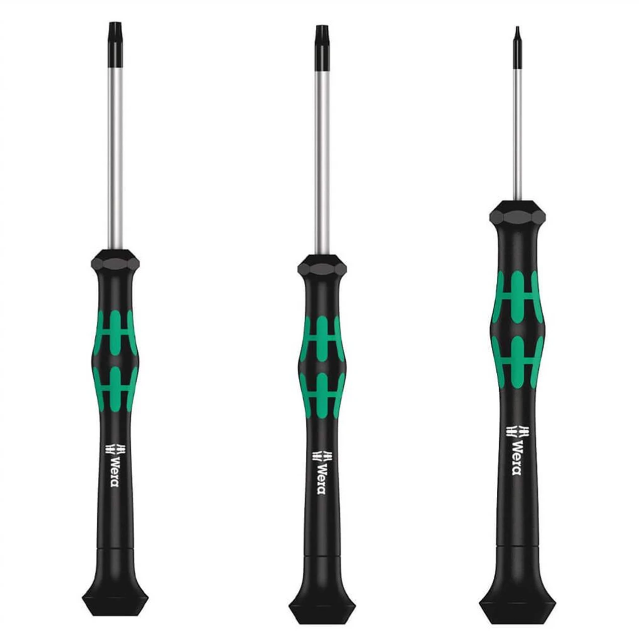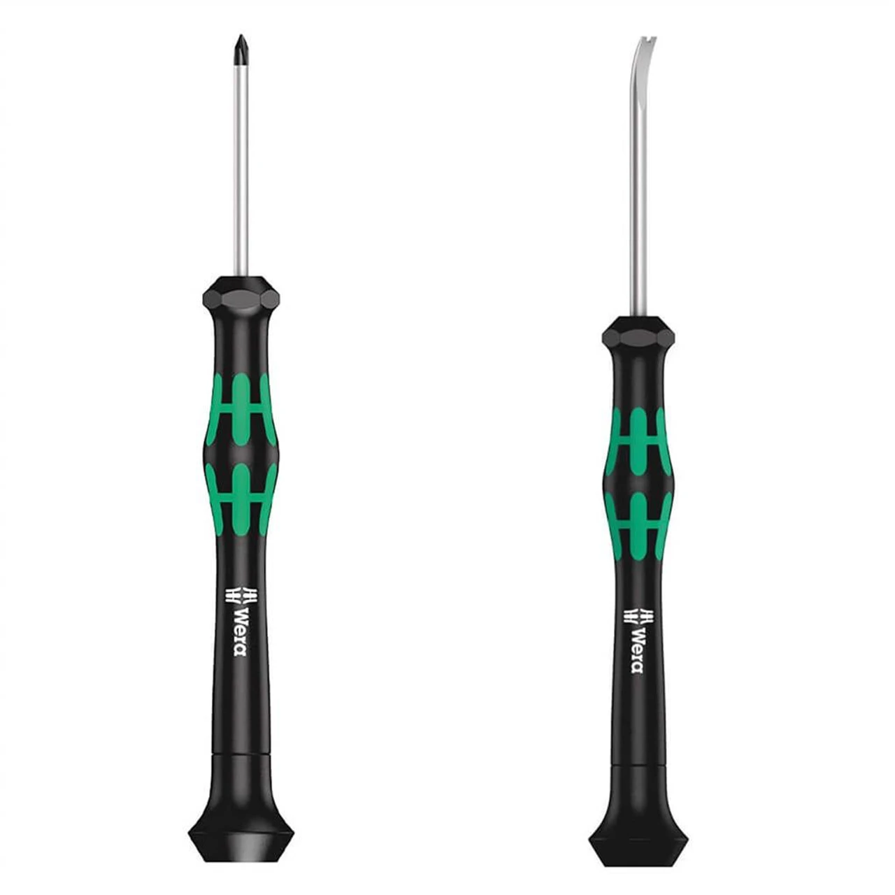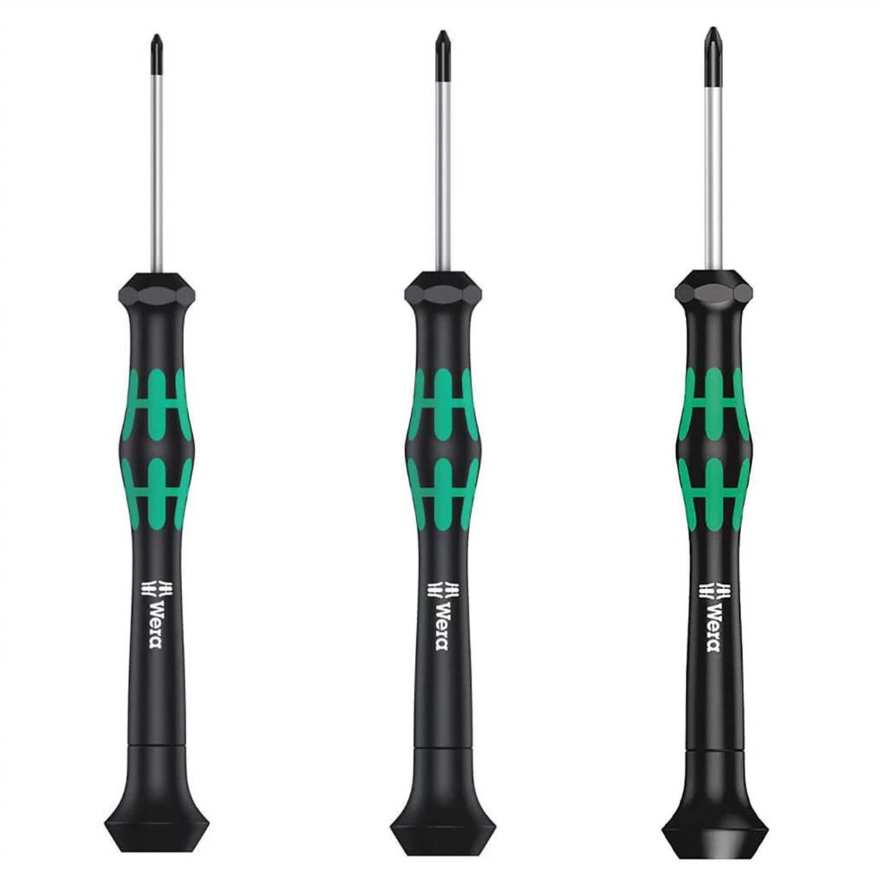 Wera 05134000001 Kraftform Big Pack Micro Screwdriver Set (25-Piece) is for fine mechanical screw connections. By supporting the hand on the rotating cap, and by the fast rotating zone below the rotating cap, lightning fast turning is possible. Time-consuming hand switching is eliminated. Storage and transport in a robust roll-bag, so the correct tool is always at hand. With Take it easy tool finder: colour coding by profile and size stamping. Features 25-piece Kraftform Micro screwdriver set in a robust and compact roll bag Kraftform Micro handle with swivel cap for rapid twisting Tools with anti-roll protection and rotating cap for fast turning Wera Black Point tip offers and exact fit and optimum corrosion protection Take it easy tool finder: colour coding according to profile and size The refined screwdriver for electronics technicians Multi-component screwdriver handle for ergonomic working Includes 2050 PH Micro (1) 05345290001 PH 000 x 40 mm, (1) 05118019001 PH 00 x 40 mm, (1) 05118026001 PH 0 x 40 mm 2067 TORX (1) 05118040001 TX 5 x 40 mm, (1) 05118042001 TX 6 x 40 mm 2067 TORX HF (1) 05118181001 TX 5 x 40 mm, (1) 05118182001 TX 6 x 40 mm, (1) 05118183001 TX 7 x 60 mm, (1) 05118184001 TX 8 x 60 mm, (1) 05118186001 TX 10 x 60 mm 2067 TORX PLUS IPR Micro (1) 05030160001 1 IPR x 40 mm 2054 Micro (1) 05118062001 0.9 mm x 40 mm, (1) 05118064001 1.3 mm x 40 mm, (1) 05118066001 1.5 mm x 60 mm, (1) 05118068001 2 mm x 60 mm 2035 Micro (1) 05118002001 0.23 x 1.5 x 40 mm, (1) 05118004001 0.30 x 1.8 x 60 mm, (1) 05117997001 0.35 x 2.5 x 40 mm, (1) 05118006001 0.4 x 2 x 60 mm, (1) 05118008001 0.4 x 2.5 x 80 mm, (1) 05118010001 0.5 x 3 x 80 mm 2069 Micro (1) 05118120001 4 mm x 60 mm, (1) 05118126001 5.5 mm x 60 mm 2072 (1) 05118145001 m x 40 mm 1429 (1) 05027456001 1 mm x 3.5 mm x 50 mm (1) K240 240 mm x 50 mm