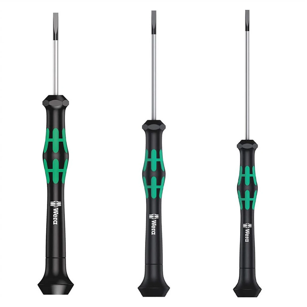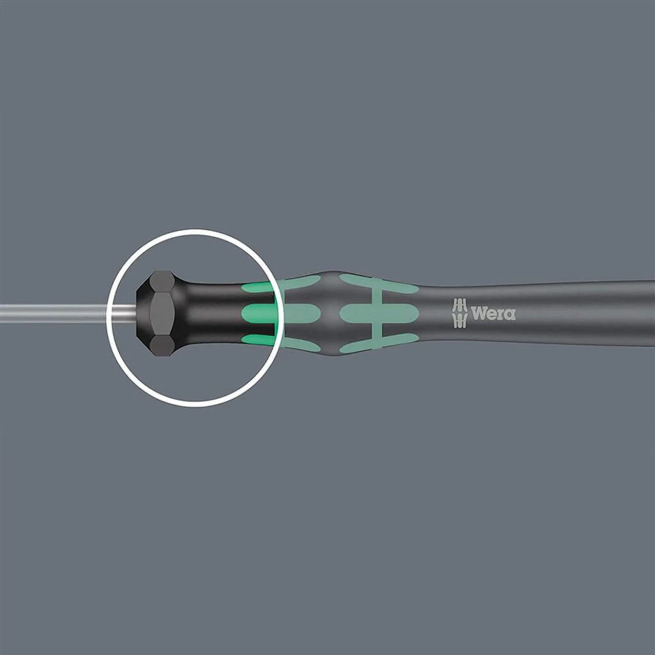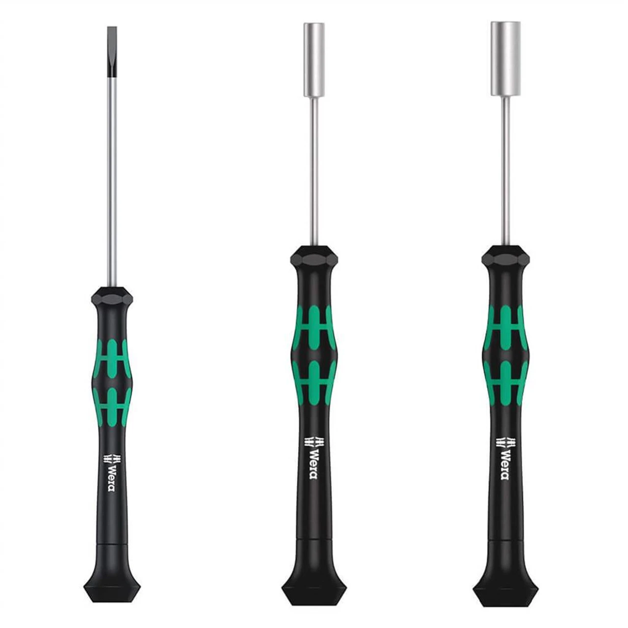 Wera 05134000001 Kraftform Big Pack Micro Screwdriver Set (25-Piece) is for fine mechanical screw connections. By supporting the hand on the rotating cap, and by the fast rotating zone below the rotating cap, lightning fast turning is possible. Time-consuming hand switching is eliminated. Storage and transport in a robust roll-bag, so the correct tool is always at hand. With Take it easy tool finder: colour coding by profile and size stamping. Features 25-piece Kraftform Micro screwdriver set in a robust and compact roll bag Kraftform Micro handle with swivel cap for rapid twisting Tools with anti-roll protection and rotating cap for fast turning Wera Black Point tip offers and exact fit and optimum corrosion protection Take it easy tool finder: colour coding according to profile and size The refined screwdriver for electronics technicians Multi-component screwdriver handle for ergonomic working Includes 2050 PH Micro (1) 05345290001 PH 000 x 40 mm, (1) 05118019001 PH 00 x 40 mm, (1) 05118026001 PH 0 x 40 mm 2067 TORX (1) 05118040001 TX 5 x 40 mm, (1) 05118042001 TX 6 x 40 mm 2067 TORX HF (1) 05118181001 TX 5 x 40 mm, (1) 05118182001 TX 6 x 40 mm, (1) 05118183001 TX 7 x 60 mm, (1) 05118184001 TX 8 x 60 mm, (1) 05118186001 TX 10 x 60 mm 2067 TORX PLUS IPR Micro (1) 05030160001 1 IPR x 40 mm 2054 Micro (1) 05118062001 0.9 mm x 40 mm, (1) 05118064001 1.3 mm x 40 mm, (1) 05118066001 1.5 mm x 60 mm, (1) 05118068001 2 mm x 60 mm 2035 Micro (1) 05118002001 0.23 x 1.5 x 40 mm, (1) 05118004001 0.30 x 1.8 x 60 mm, (1) 05117997001 0.35 x 2.5 x 40 mm, (1) 05118006001 0.4 x 2 x 60 mm, (1) 05118008001 0.4 x 2.5 x 80 mm, (1) 05118010001 0.5 x 3 x 80 mm 2069 Micro (1) 05118120001 4 mm x 60 mm, (1) 05118126001 5.5 mm x 60 mm 2072 (1) 05118145001 m x 40 mm 1429 (1) 05027456001 1 mm x 3.5 mm x 50 mm (1) K240 240 mm x 50 mm