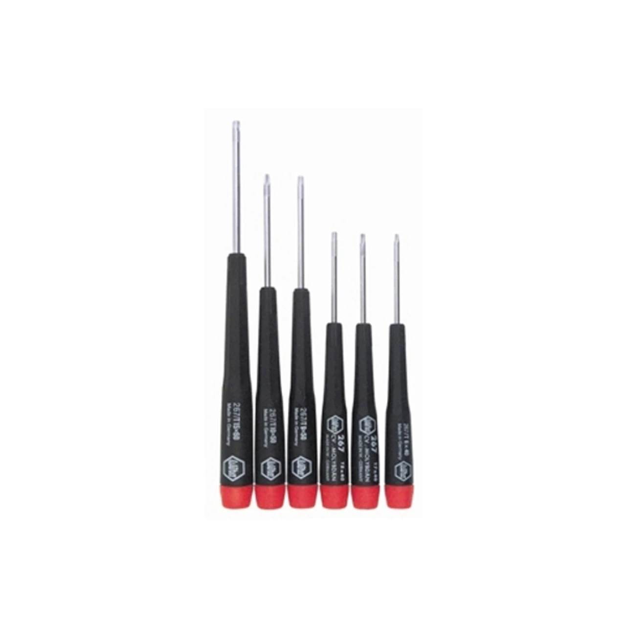 Torx Technicians Precision 6 Pc. Screwdrivers Set Sizes: T6, T7,T8,T9, T10, & T15 -Exact Fit Precision Machined Tips -Wiha Exclusive CRM-72 Special Tool Steel -Tapered Ergonomic Handle -Satin Micron Anti-corrosion Hard chromed finish -Super hardened Best wear resistance & long tool life -Handles Proportioned to Blade Size for optimum torque -Free Turning Easy Spin Finger Tip Control Cap -Molded on handle for permanent bond to blade -Guaranteed Wiha Quality – Made In Germany