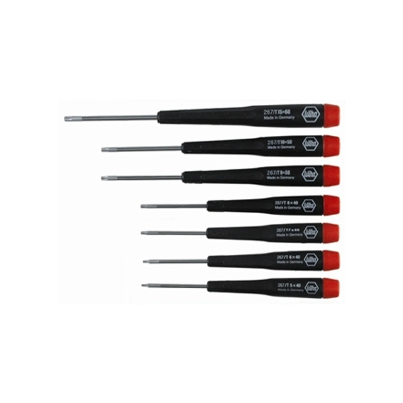 Torx Technicians Precision 7 Piece Screwdrivers Set Sizes Torx: T5, T6, T7, T8, T9, T10, & T15 •Exact Fit Precision Machined Tips •Wiha Exclusive CRM-72 Special Tool Steel •Tapered Ergonomic Handle •Satin Micron Anti-corrosion Hard chromed finish •Super hardened Best wear resistance & long tool life •Handles Proportioned to Blade Size for optimum torque •Free Turning Easy Spin Finger Tip Control Cap •Molded on handle for permanent bond to blade •Guaranteed Wiha Quality – Made In Germany