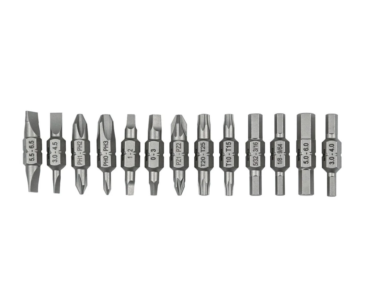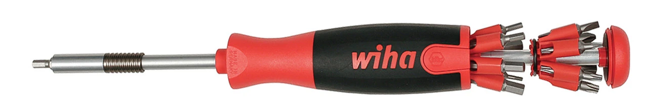 Phillips, Slotted, PoziDriv, Square, Hex Inch, Hex Metric, Torx Ultra Compact, Ultra Lightweight, Ultra Convenient, Saves Time, Fewer Tools to Carry, Less Weight, 26 Tips. 13 Premium double-ended bits, Ergonomic Soft Grip Handle, Locking bit holder. FEATURES: 26 Bit Tips, Quick access, the right bit for the job. Comfortable Cushion Grip Ergonomic Handle Spring driven pop up cartridge for fast bit selection Ultra Compact Design Made In Germany High Performance Quick Release Locking Bit Holder Hardened and Tempered CVM Tool Steel Bits Precision machined for an exact fit. All the drivers you need when and where you need them. Grab and Go Convenience SPECIFICATIONS: Phillips #1+#2, #0+#3 Slotted 3.0+4.5, 5.5+6.5 PoziDriv #1+#2 Square #1+#2, #0+#3 Hex Inch 1/8+9/64, 5/32+3/16 Hex Metric 3.0+4.0, 5.0+6.0 Torx T10+T15, T20+T25  Â